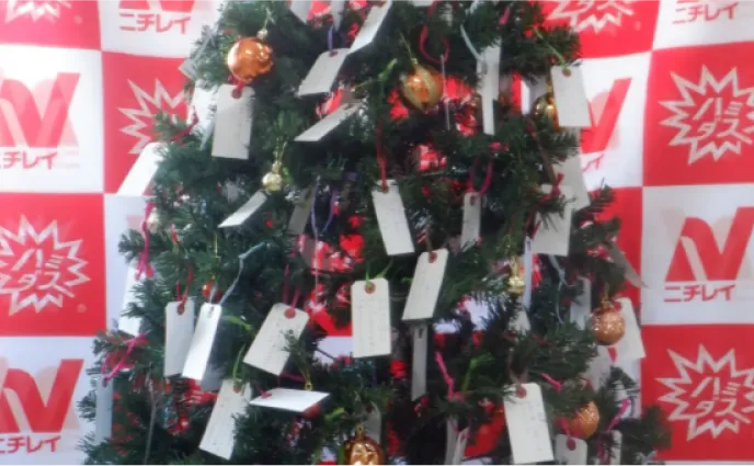 基幹工場として数多くの従業員が在籍している船橋工場にて、「普段伝えきれていない感謝の言葉を届け合えるきっかけをつくりたい!」との想いのもと、2023年12月より従業員同士が感謝の言葉を記した「ありがとうカード」をクリスマスツリーに飾る「ありがとうの木」活動が始まった。
