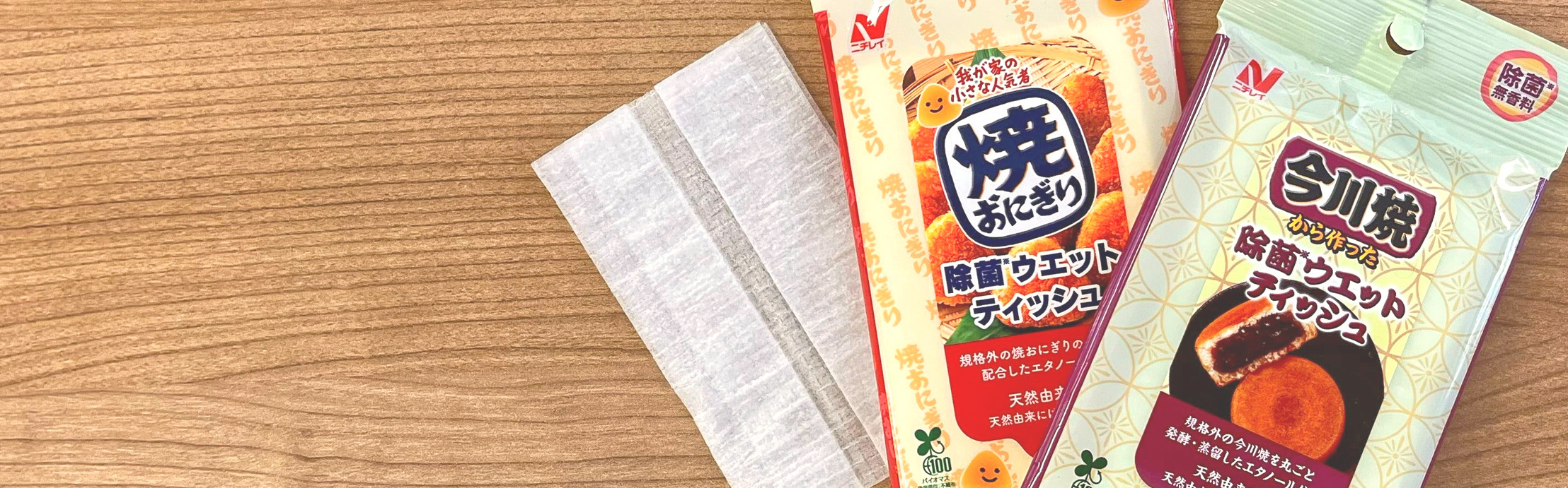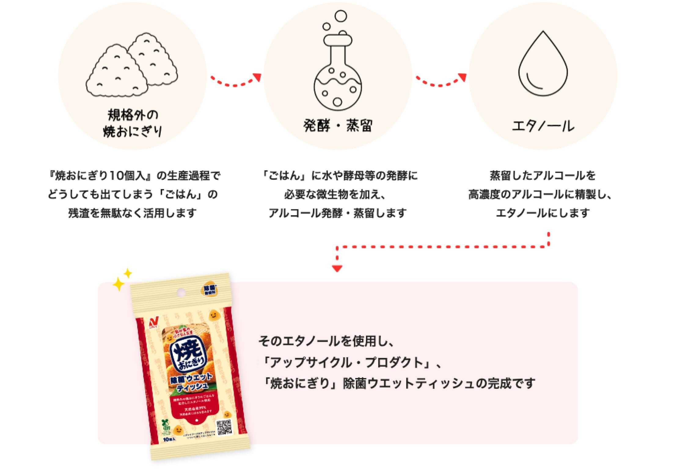 「焼おにぎり」「今川焼」除菌ウエットティッシュは、天然由来原料を99%使用した、「アップサイクル・プロダクト」です。