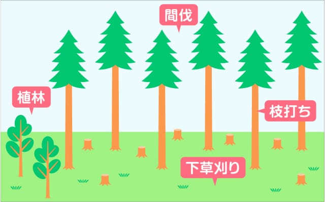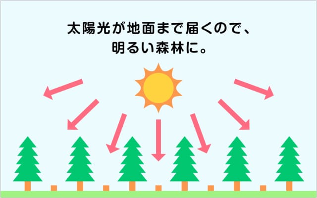 植林、枝打ち、下草刈り、間伐などが行われると、日光が差して元気な木が育ち、森林は健全な機能を発揮します。