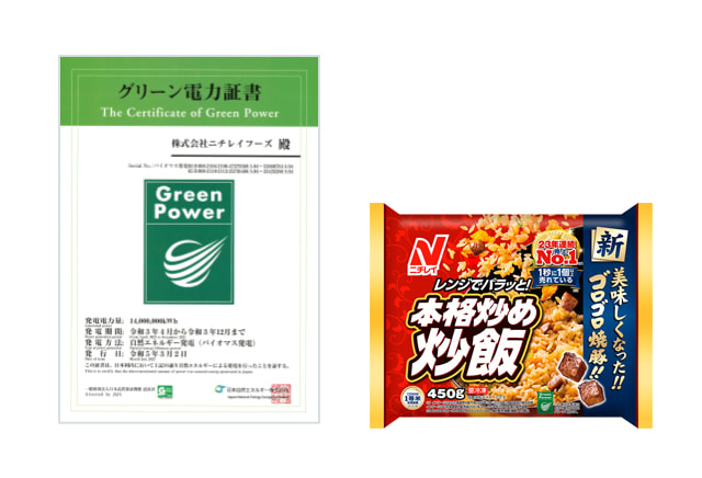 ニチレイフーズでは、2020年3月より年間約1,000万kWhのグリーン電力証書を購入し、「本格炒め炒飯®」の製造ラインで使用する電力相当分に活用し、再生可能エネルギーに転換しています。