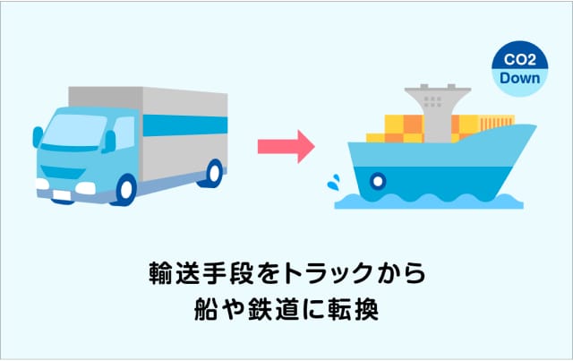 また、フェリーや鉄道を活用するモーダルシフト実施しています。トラックより一度にたくさん運べるフェリーや鉄道は、CO2の排出量を抑えることができます。フェリーの活用においては、エコシップマークを取得しています。