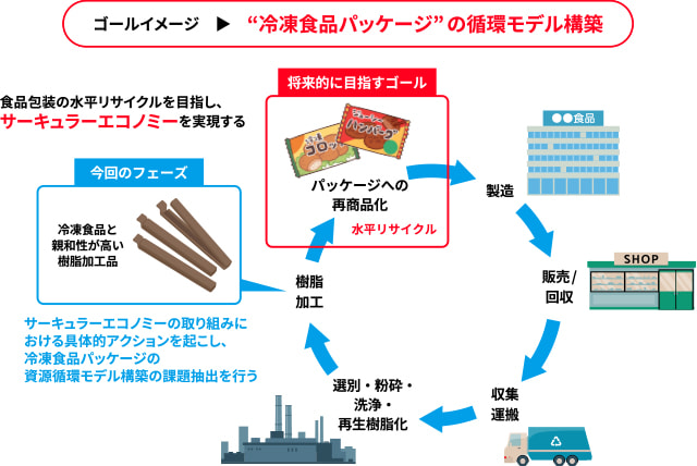 冷凍食品包装(フィルム)の店頭回収を行い、回収したプラスチックをクリップなどの樹脂加工品にリサイクルするための実証実験を開始します。