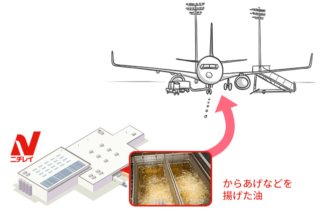 ニチレイフーズでは国内生産工場の廃食用油を株式会社レボインターナショナルへ納入し、同社・コスモ石油株式会社・日揮ホールディングス株式会社・合同会社 SAFFAIRE SKY ENERGYの4社が建設したSAF製造設備で国産SAFが製造されます。