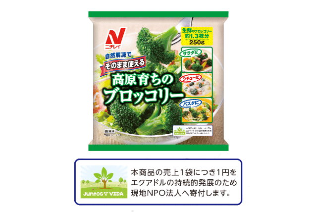 『そのまま使える 高原育ち®のブロッコリー』の「売上1袋につき1円」をエクアドル大使館の後援を得て現地NPOへ寄付し、エクアドルの持続的発展を継続支援しています。