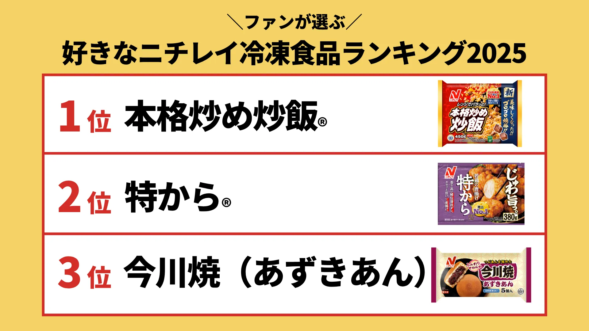 - 名称 :ファンが選ぶニチレイ冷凍食品ランキング2025