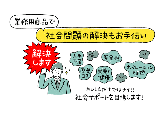 家庭用の商品よりも断然数が多いのが、業務用商品で、なんと1000種類以上あるんです。スーパーやレストランの担当者と一緒にメニューを開発することも。