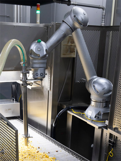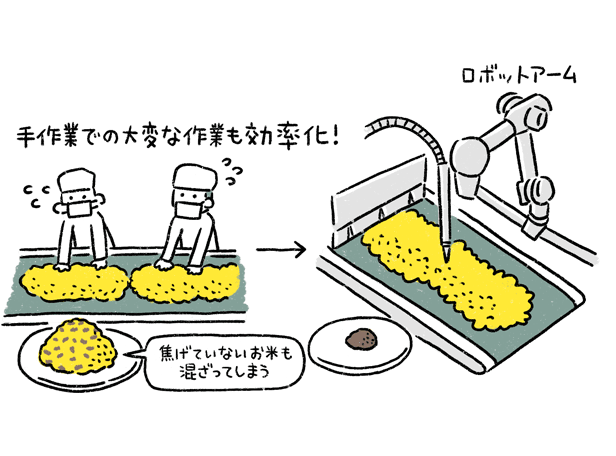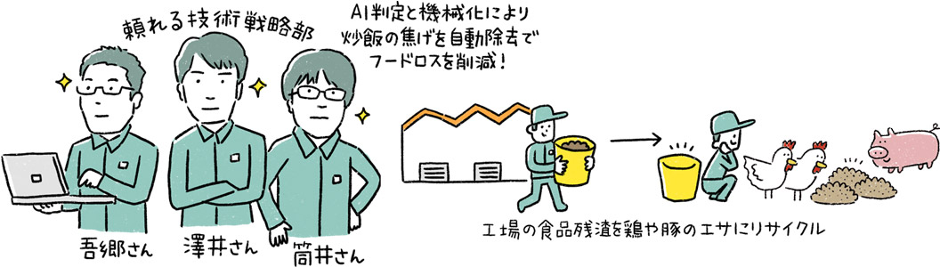 近年はAIを導入して、炒飯の焦げやチキンの血合いなど、廃棄する部分を極力ピンポイントで除去し、フードロスを減らすとともに、人力でやっていた作業の省力化にも貢献しました。このAIも、社内で開発しています。