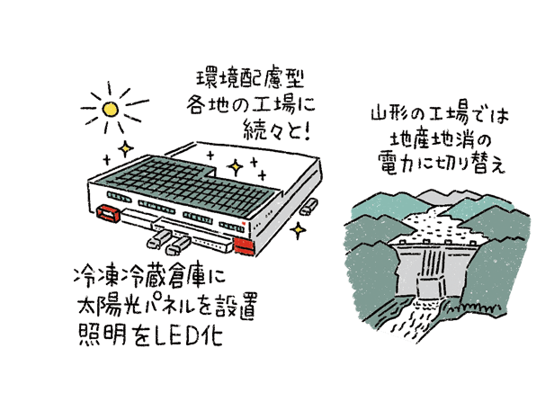 冷凍食品は、生産時や輸送時に必ず電力が必要な商品だからこそ。工場でのCO₂排出量削減には力を入れています。