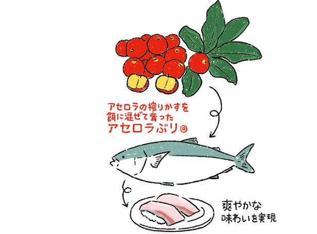 近畿大学とニチレイグループは、水産資源の枯渇問題やフードロス問題の解決の一助とすべくアセロラ養殖魚の共同研究を進めてきました。ビタミンCを多く含むアセロラの搾りかすを一定量養殖魚のエサに混ぜることで、ぶりを「持続する鮮やかな赤身」と「爽やかな味わい」に仕上げました。