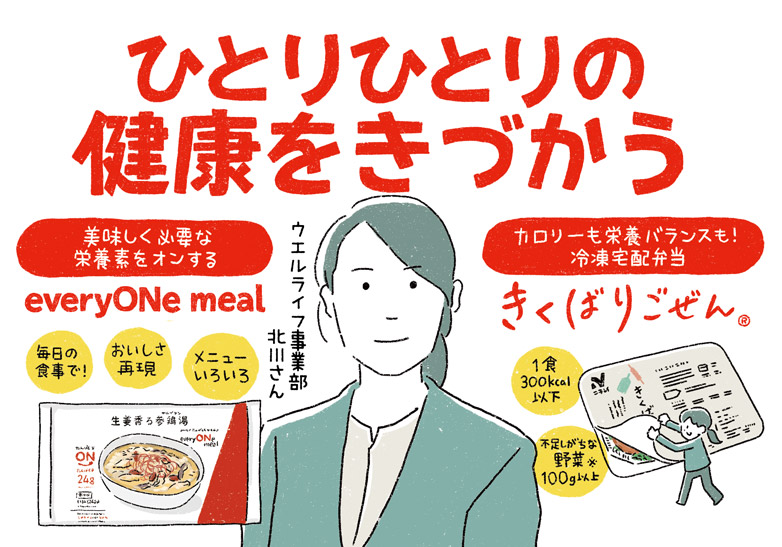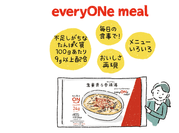 たとえば不足しがちなたんぱく質を日頃の食事で無理なく摂れる「everyONe meal」もシリーズを増やしています。