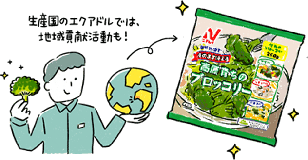 ニチレイフーズが早くから取り組んでいるサステナビリティのひとつが「調達方法」。契約農家との信頼関係を重視し、独自のサポート体制と農家の支援等を行い、サステナブルな調達を実現しています。エクアドルでは、現地のブロッコリー農家の生活環境改善に取り組む現地NPO法人へ、寄付を行っています。またブラジルのアセロラ契約農家には、全量買い取りや苗木の無償提供、栽培ノウハウの講習などで、安心して農業を続けられる環境を提供しています。