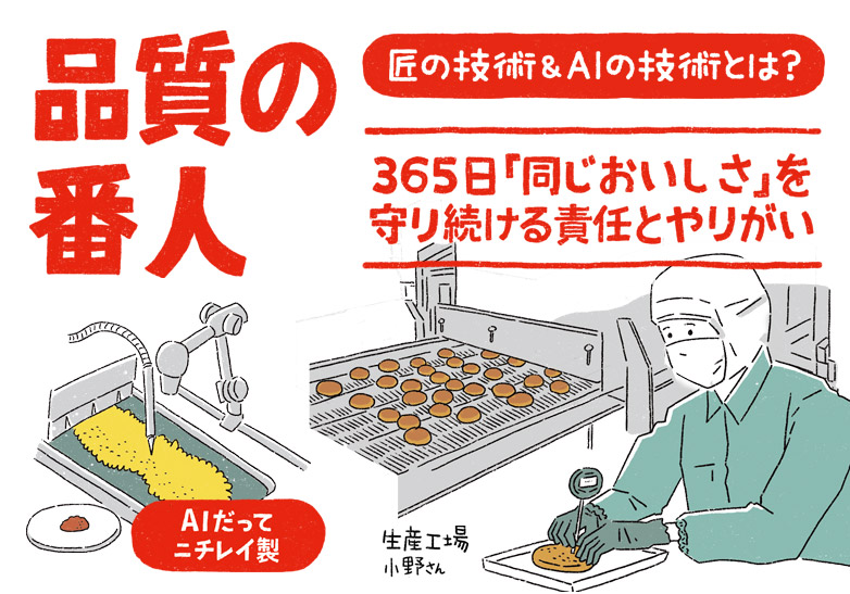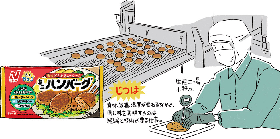 季節で食材の質も変われば、工場の気温や湿度も変わります。食べ物は同じようにつくっても同じものができるとは限りません。だから私たちは、五感をフル活用して、ほんの少しのその差にこだわり、おいしさと品質を維持しています。