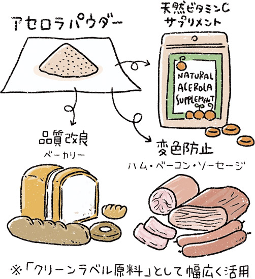 天然ビタミンCが豊富なアセロラは、機能性素材として食品・飲料に使われるだけでなく、酸化防止剤のかわりや、食品の品質改良、化粧品の原料などにも使われています。